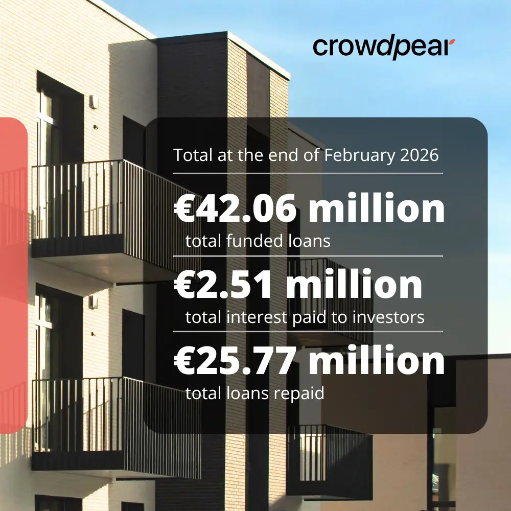 In February, Crowdpear investors in total funded €2.18 million in real estate-backed loans. By the end of the month, the total volume of loans funded through the platform reached €42.06 million.