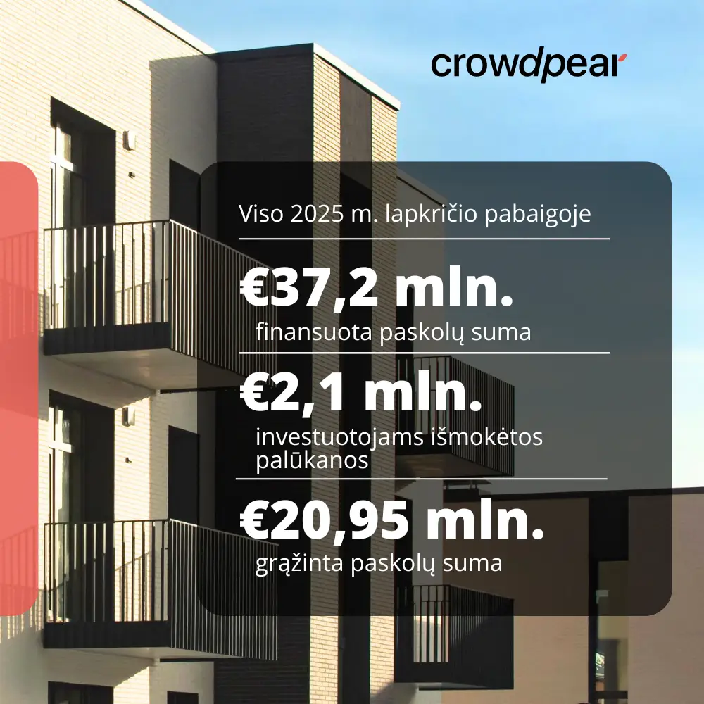 Lapkritį investuotojams grąžinta 811 090 EUR investicijų į paskolas (neskaitant palūkanų). Iš viso jau grąžintos 229 platformoje finansuotos paskolos, kurių bendra vertė viršija 21,18 mln. EUR. Stabili paskolų grąžinimų dinamika atspindi atsakingą Crowdpear rizikų valdymą ir kruopštų platformoje pateikiamų projektų atrankos procesą.