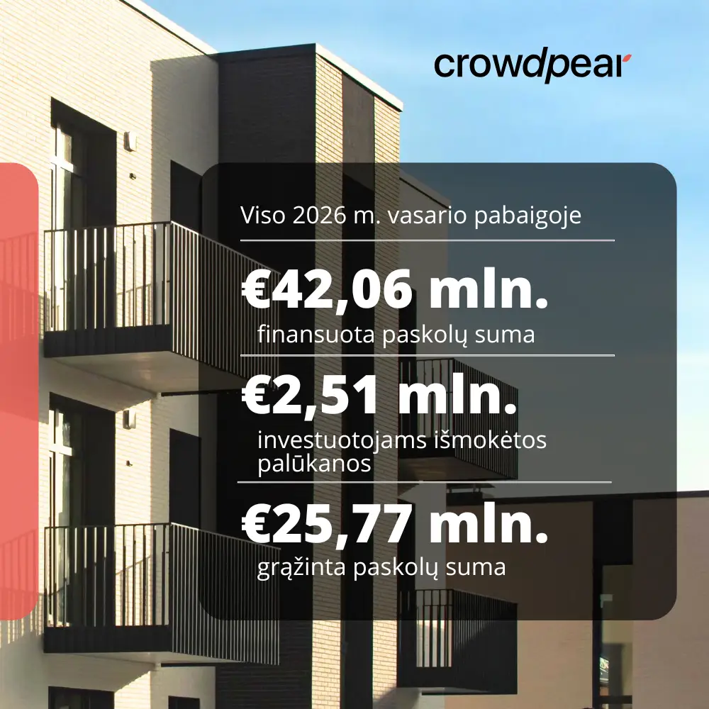 Vasario mėnesį Crowdpear investuotojai viso finansavo 2,18 mln. EUR nekilnojamuoju turtu užtikrintų paskolų.