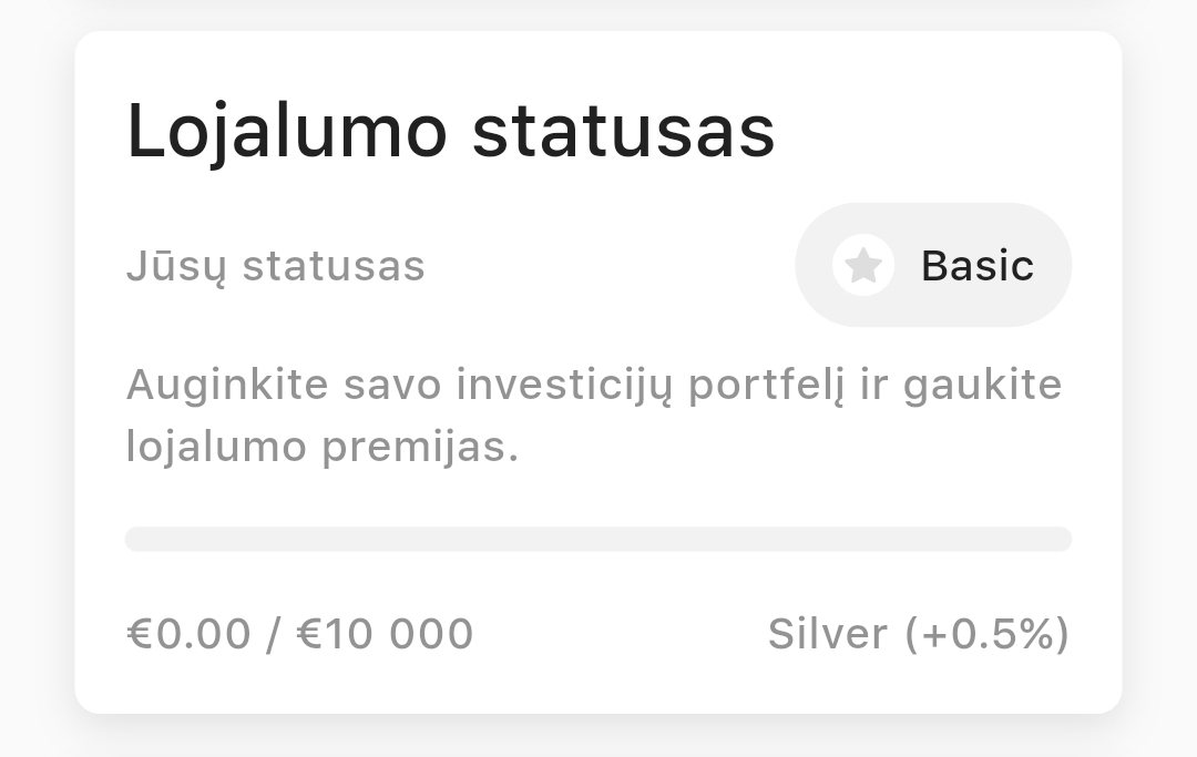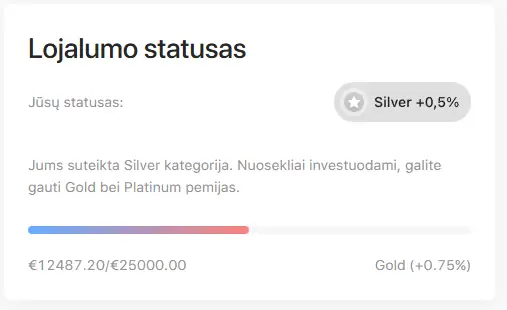 Atlikus galimo lojalumo kategorijos suteikimo skaičiavimus, jūs būsite priskirtas prie Sidabrinės lojalumo programos. Papildomas +0,5% palūkanų priedas bus automatiškai pritaikytas visoms naujoms jūsų investicijoms.