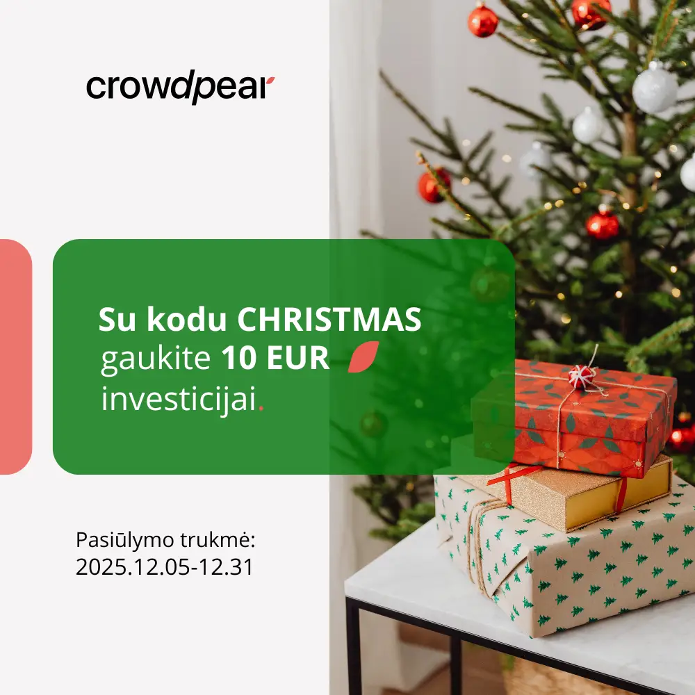 Artėjančių gražiausių metų švenčių proga jums parengėme kalėdinę dovanėlę – investuokite su kodu CHRISTMAS ir gaukite EUR 10 premiją papildomai investicijai. Dėkojame jums už jūsų pasitikėjimą, lojalumą ir partnerystę bei linkime gražaus švenčių laukimo.