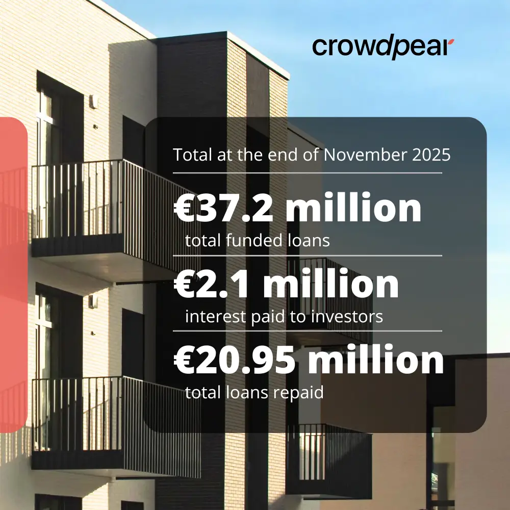 In November, Crowdpear investors funded 17 real estate–backed loans with a total value of €1.68 million. By the end of the month, the total volume of loans funded through the platform reached €37.2 million, across a total of 399 loan units.