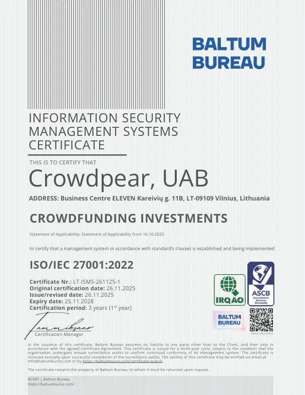 Crowdpear has officially received the ISO/IEC 27001:2022 certificate — becoming the first crowdfunding platform in Lithuania to achieve compliance with the world’s leading standard for Information Security Management Systems (ISMS).