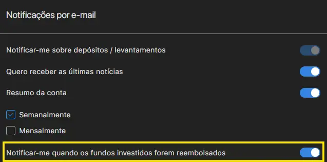 Para receber notificações por e-mail relativas ao reembolso dos fundos investidos, aceda a ‘Definições pessoais’ e selecione a opção ‘Notificar-me quando os fundos investidos forem reembolsados’.