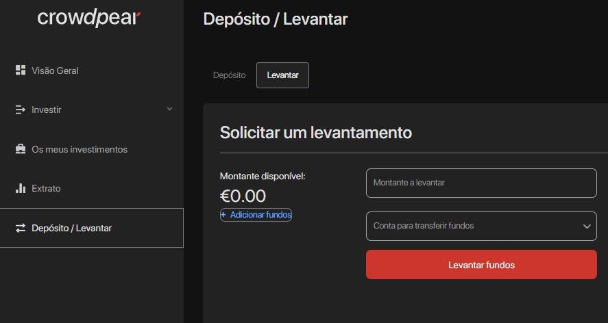 Para levantar os seus fundos não investidos, vá a ‘Depositar/Levantar’ -> ‘Levantar’ no seu perfil, introduza o montante a levantar, selecione a conta bancária para a qual os fundos serão transferidos e confirme o pedido clicando em ‘Levantar fundos’: