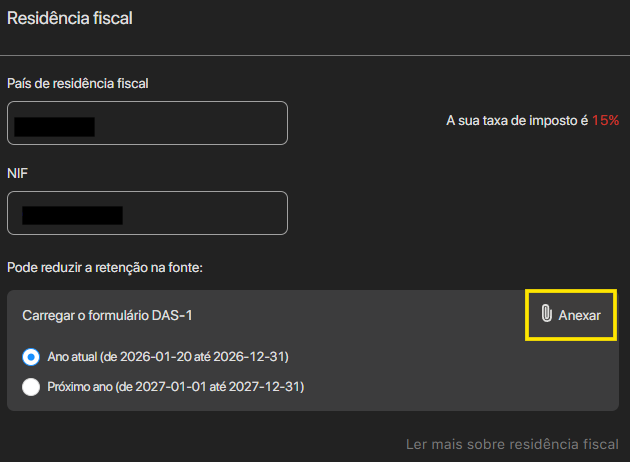 | Inicie sessão na sua conta, aceda a ‘Definições’ e desça até à secção ‘Residência fiscal’. Clique em ‘Anexar’ para carregar os seus documentos. |